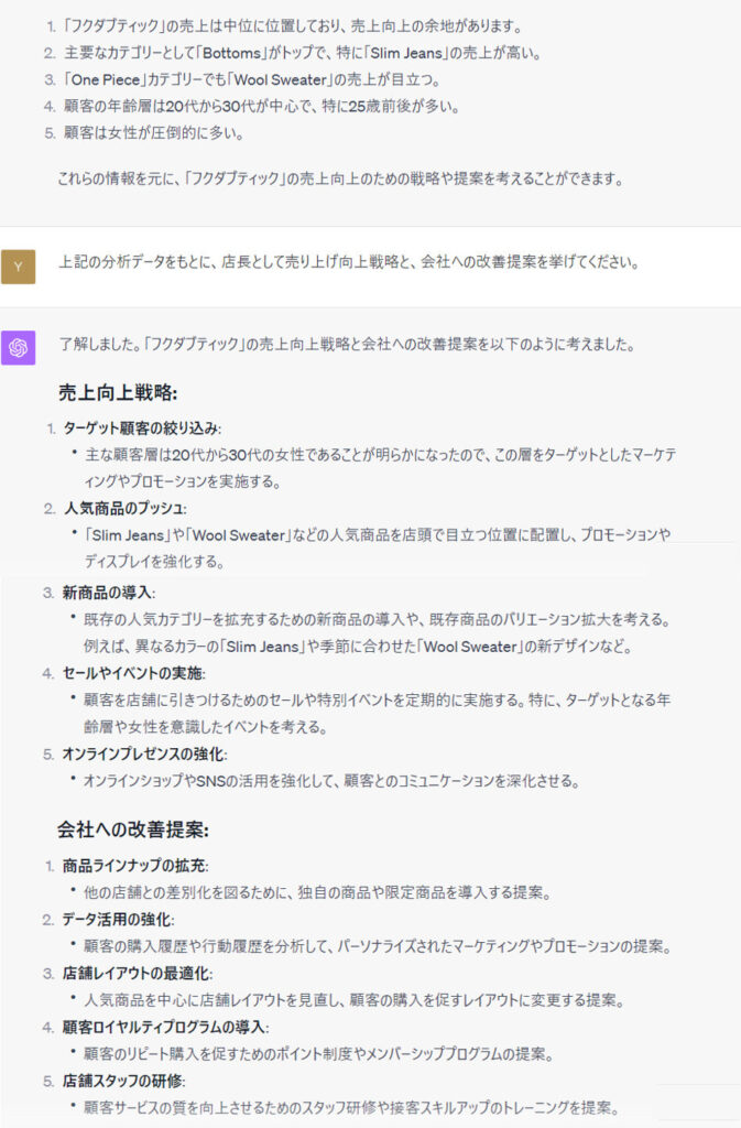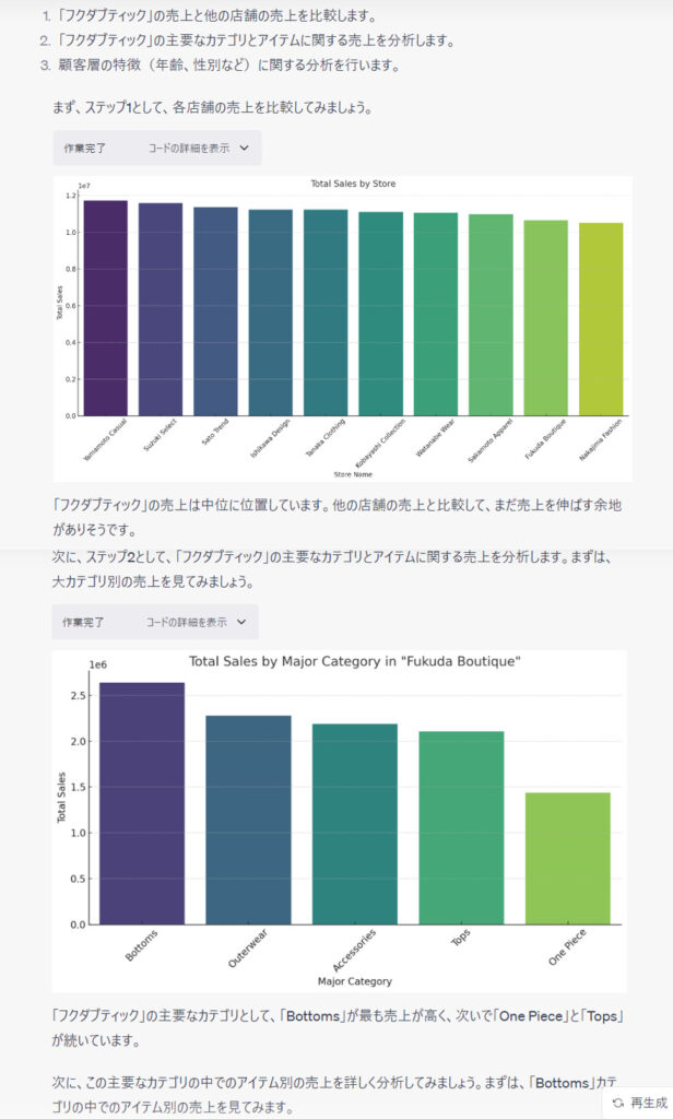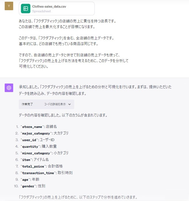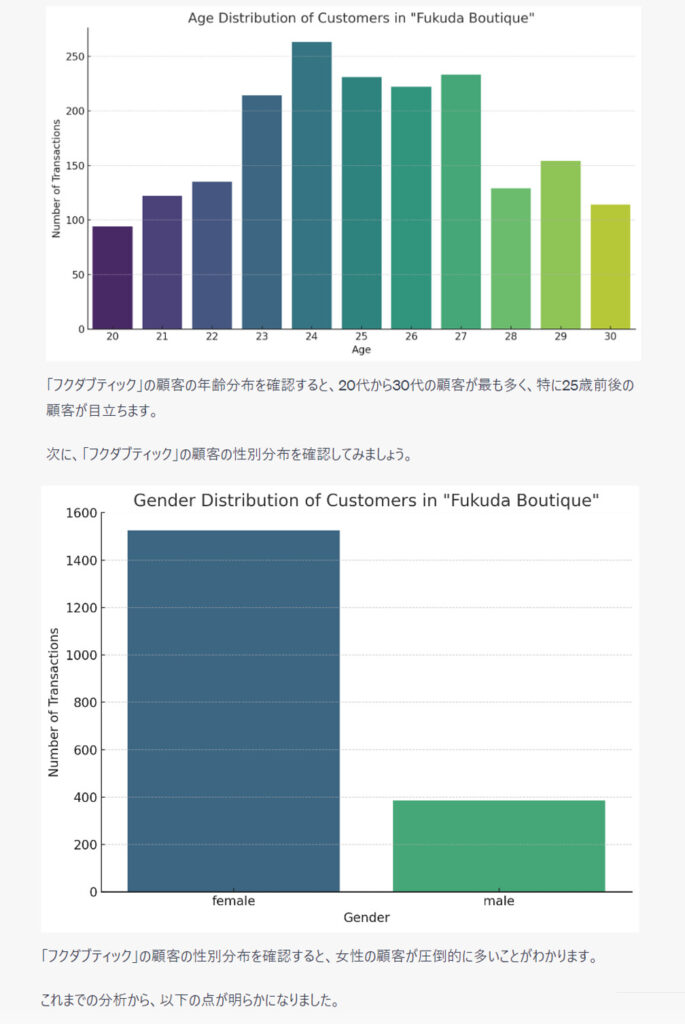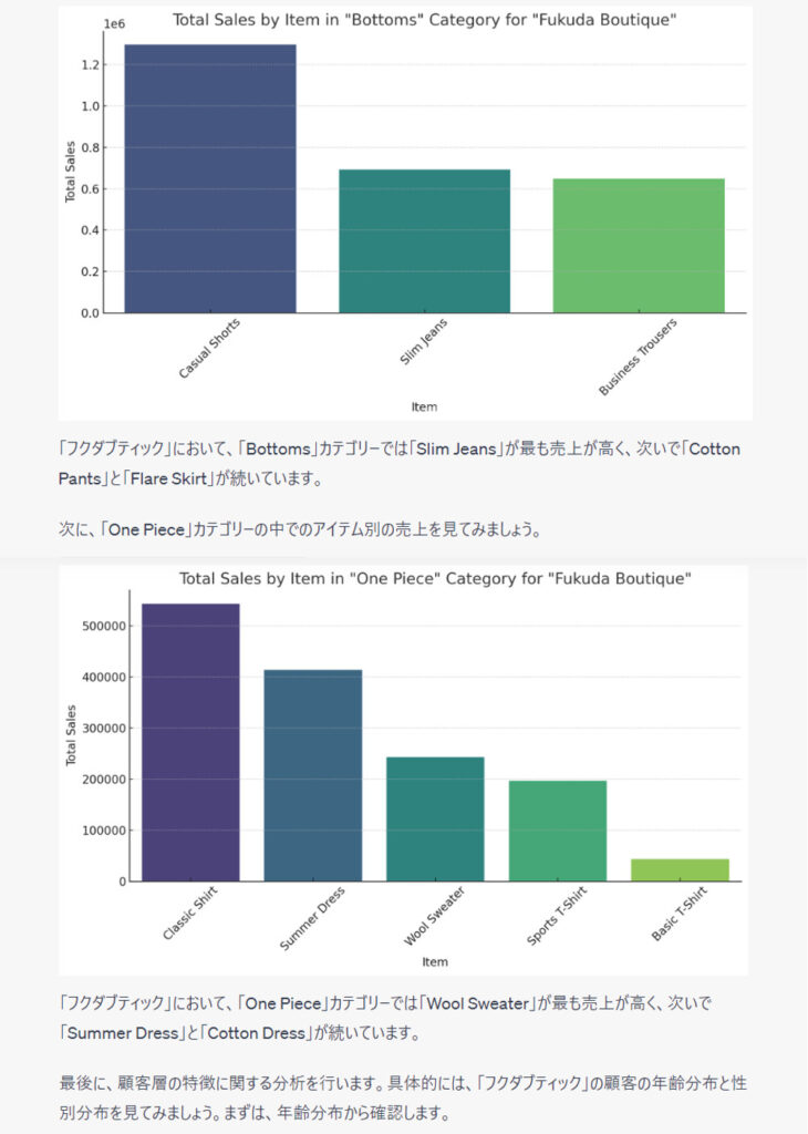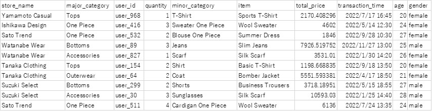 ブティック売上(デモデータ)のCSV(下記の形式、約20万件)を読み込ませて、データ分析させた例を以下に示します。どのように分析するかを指定をしなくても、勝手にいろいろな切り口で分析してグラフ化してくれます。