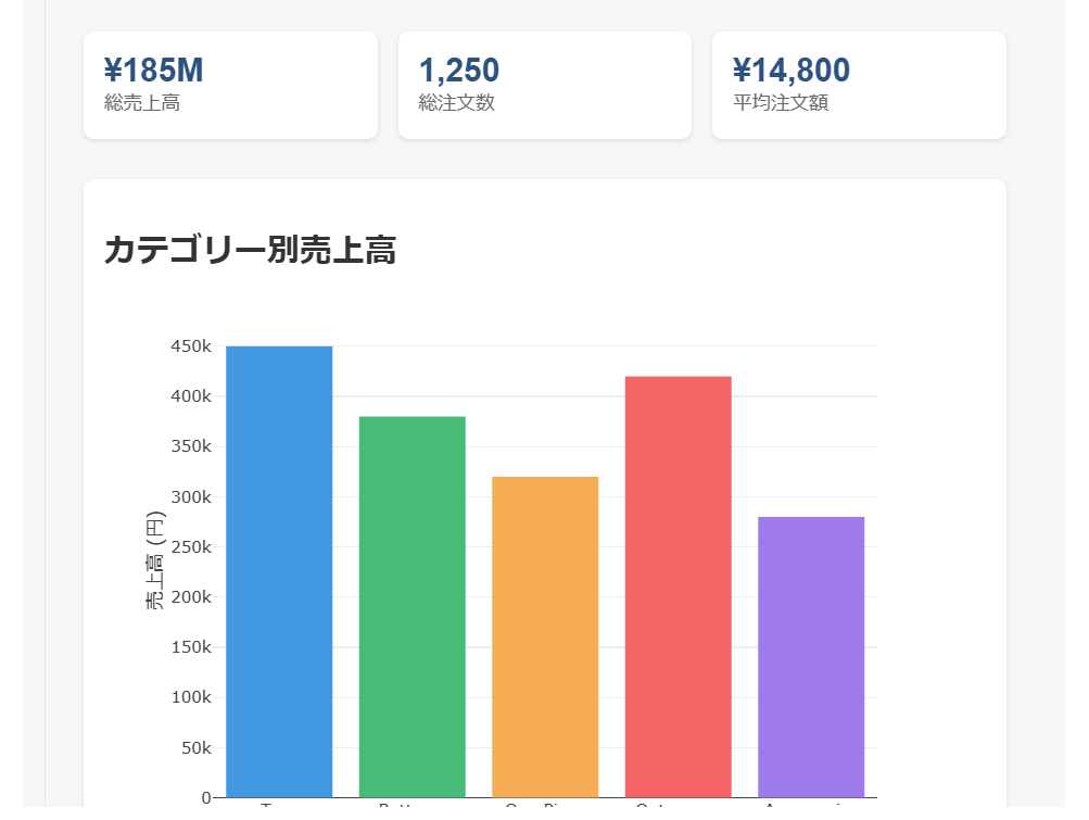 JavaScriptを利用したリアル分析ツールで、CSVやPDFをアップロードすることで、グラフやチャートなどを生成することが可能です。