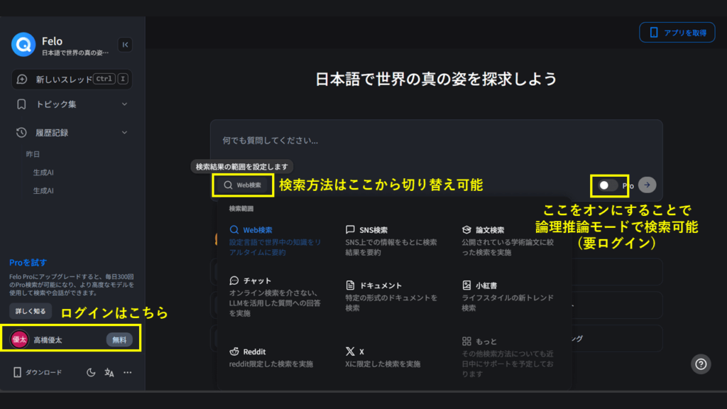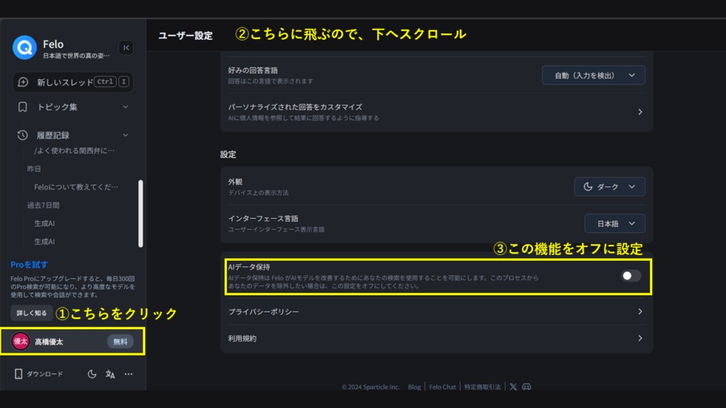 「Felo」は無料状態でも使用できますが、その状態だと「入力内容をAIの学習に利用する」設定になってしまいます。そのため、使用する前にサ登録&ログインを行い、以下の設定からAI学習をオフにするようにしてください。