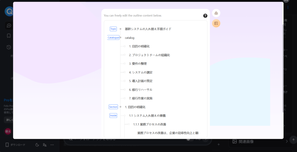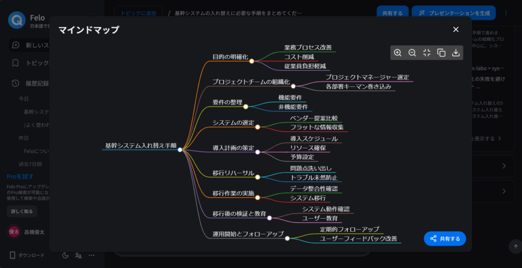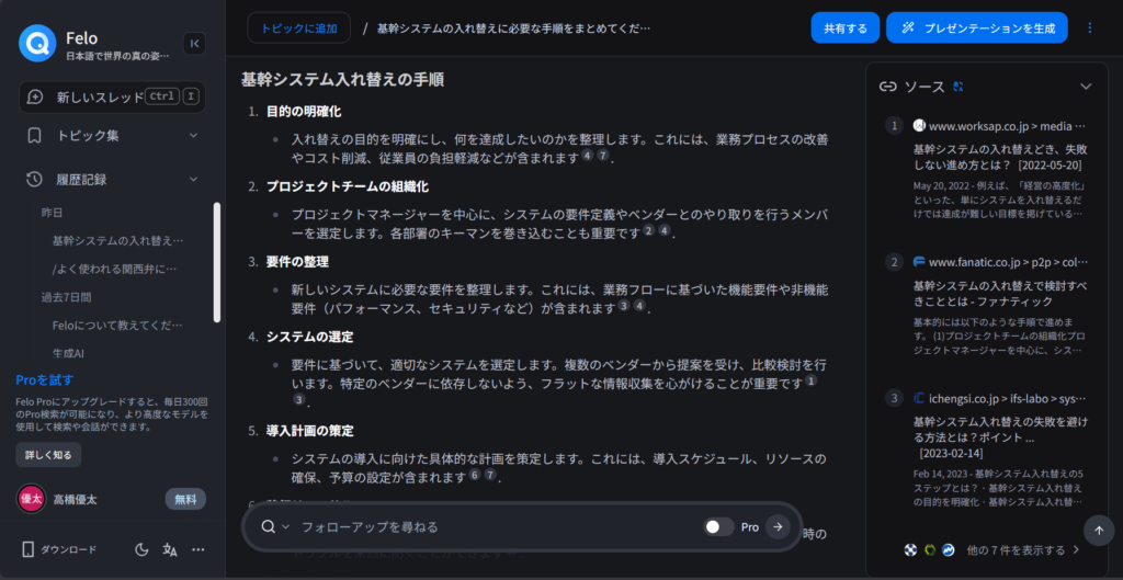 試しに「基幹システムの入れ替えに必要な手順をまとめてください」と質問してみます。