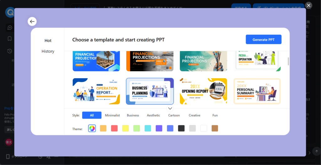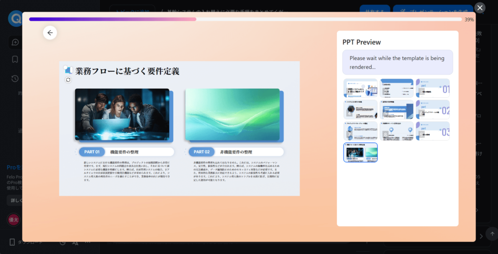また、画面右上にある「プレゼンテーションを生成」ボタンを押すことで、スライド形式でまとめてくれます。