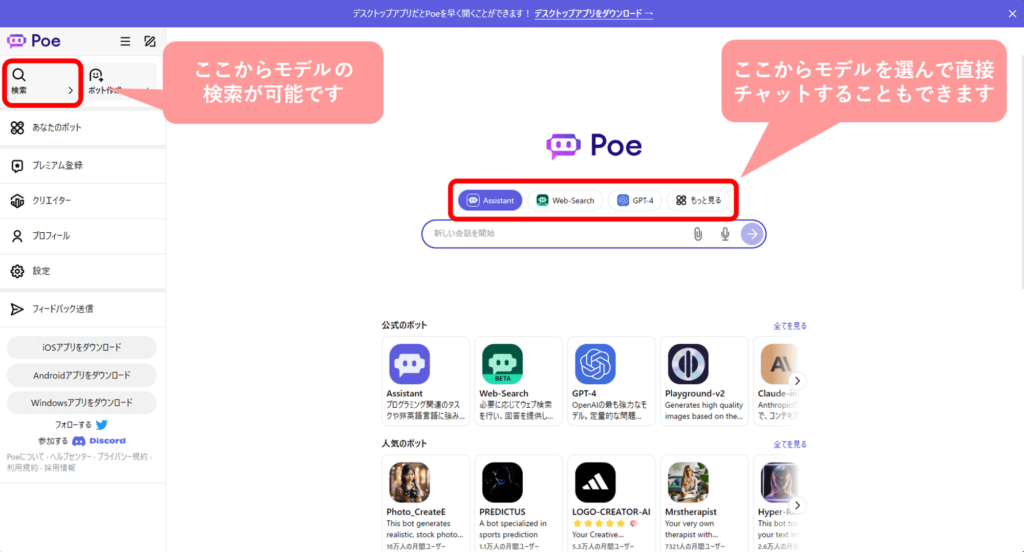 Poeでは任意のモデルを選んで会話をはじめます。モデルは左上の検索ボタンから検索が可能です。中央の検索窓上部に使用したいモデルがある場合は、ここから選んで直接会話を始めることもできます。