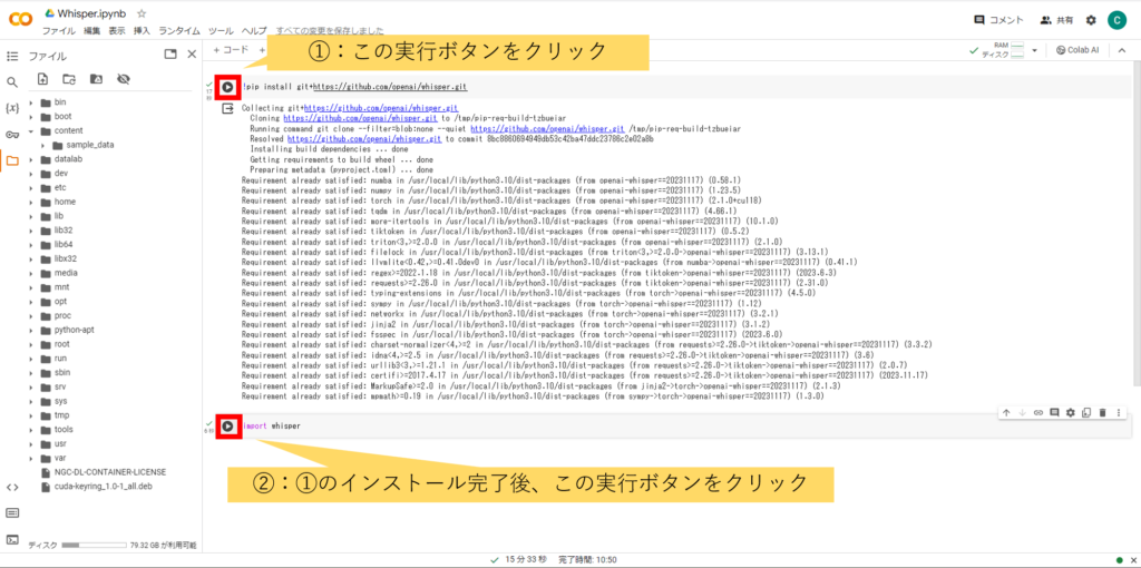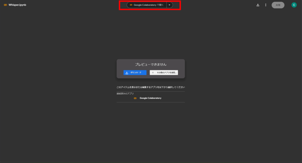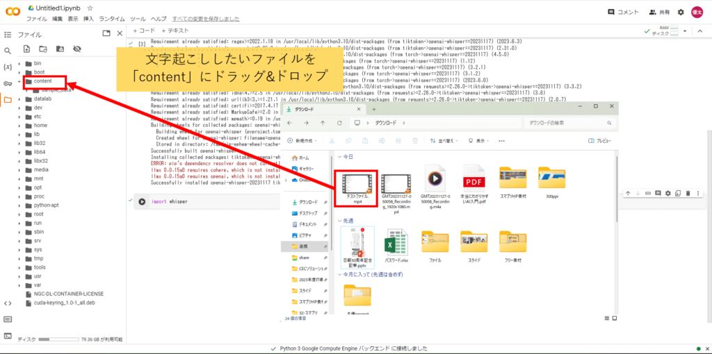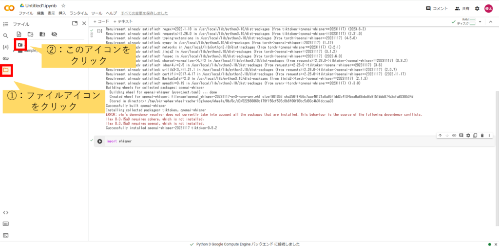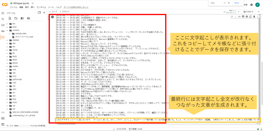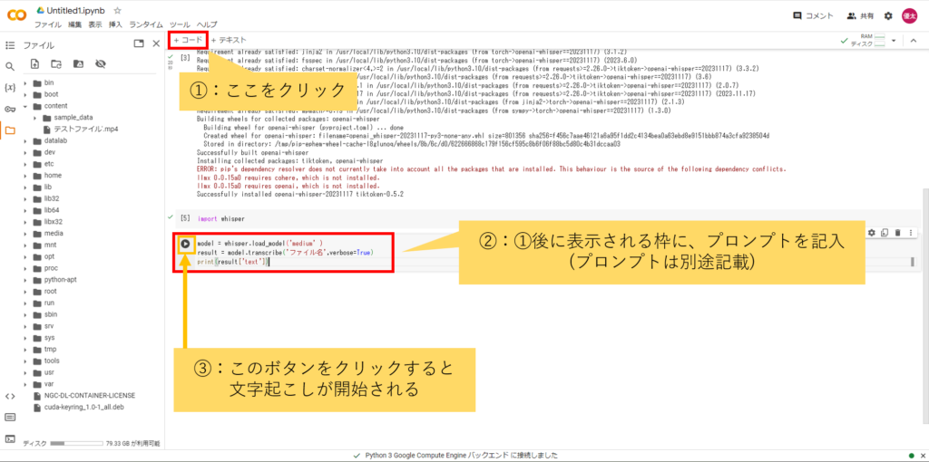 ⑤「+コード」クリックで表示される入力欄に、以下のプロンプトを入力。その後、▶ボタンをクリックすると、音声データの文字起こしが始まる
