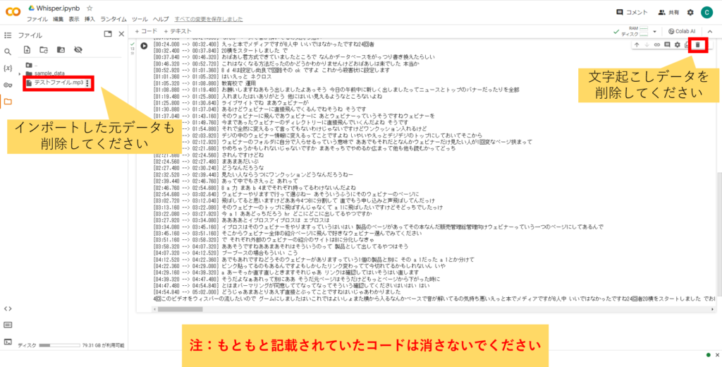 ⑦文字起こしデータ、インポートした元データを削除してください。この際、もとから記載されていたコードは消さないでください。